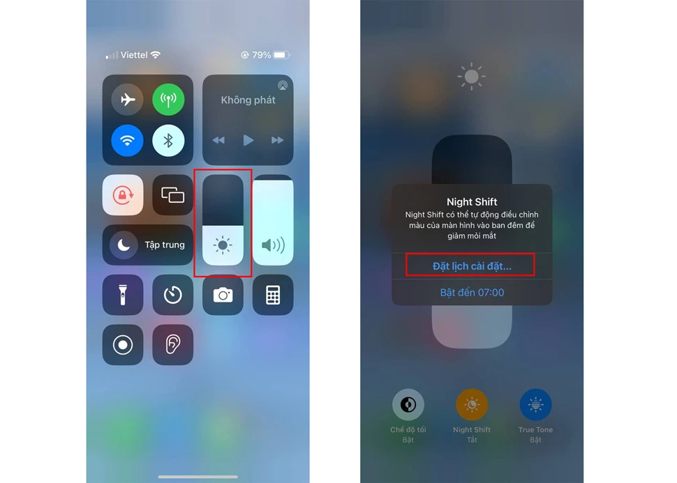 Bước 1: Mở Trung tâm điều khiển bằng cách kéo từ trên xuống ngay góc trên bên phải của iPhone (với thiết bị có Face ID), hoặc vuốt từ dưới lên (với máy có Touch ID)> nhấn giữ vài giây lên thanh điều chỉnh độ sáng > nhấn vào Night Shift để bật > nhấn vào Đặt lịch cài đặt.