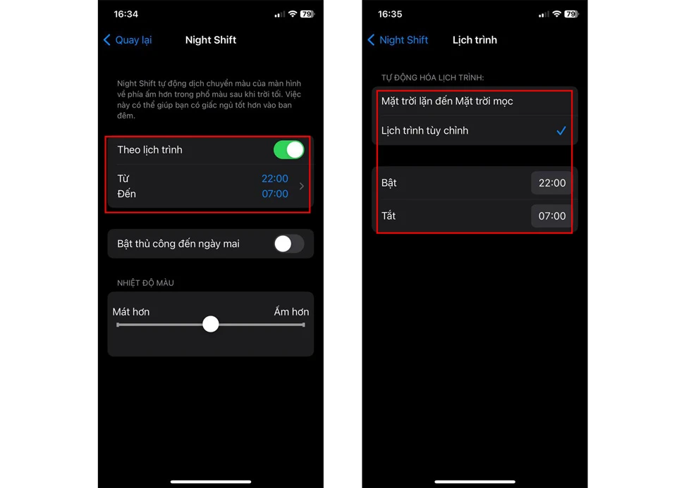 Bước 2: Gạt sang phải tại mục Theo lịch trình > chọn Lịch trình tùy chỉnh hoặc chọn Mặt trời lặn đến Mặt trời mọc.