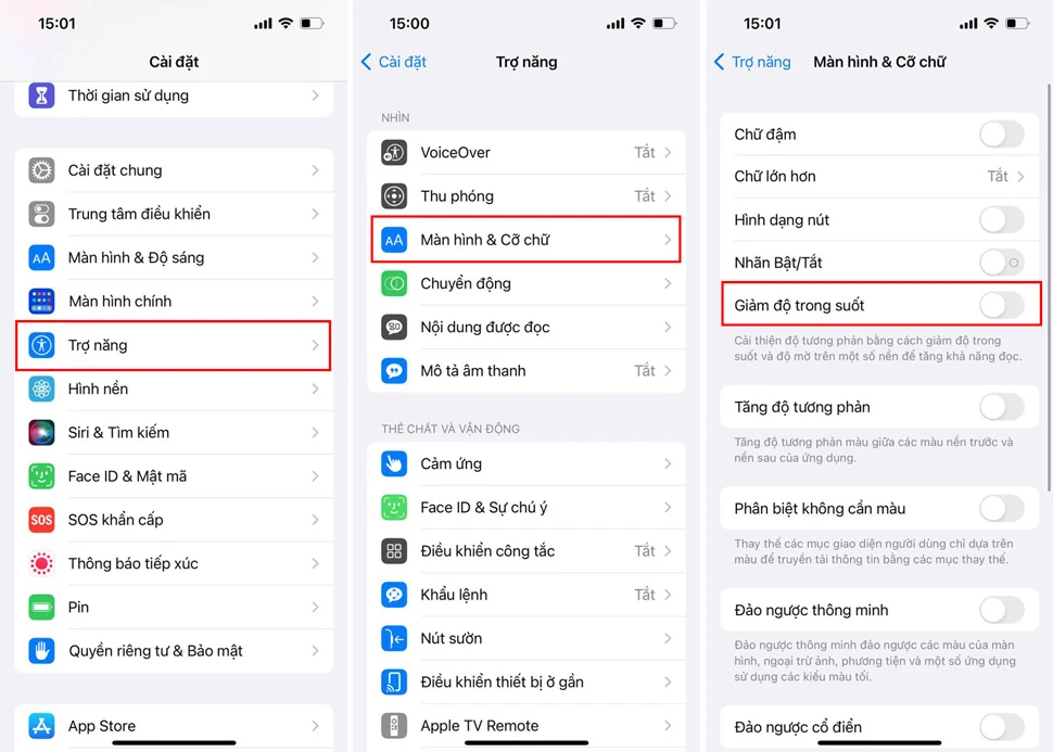 Bước 2: Gạt sang phải để bật Giảm độ trong suốt.