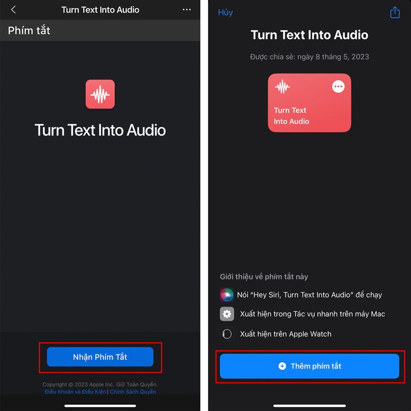 Bước 1: Bạn nhấn chọn vào đường link dưới này để thêm phím tắt Turn Text to Audio vào máy < Chọn Thêm phím tắt > Nhận phím tắt là được nha.