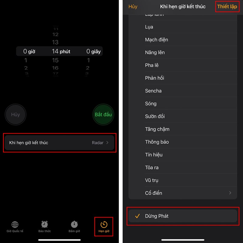 Bước 1: Đầu tiên, bạn truy cập vào ứng dụng đồng hồ trên iPhone > Chọn vào mục Hẹn giờ > Nhấn vào Khi hẹn giờ kết thúc > Vuốt xuống dưới cùng chọn vào Dừng Phát > Thiết lập.