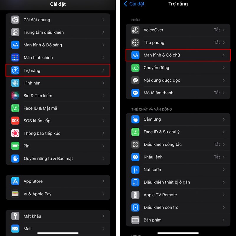 Bước 1: Truy cập vào Cài đặt > Kéo xuống dưới và chọn vào phần Trợ năng > Nhấn chọn vào Màn hình & Cỡ chữ.