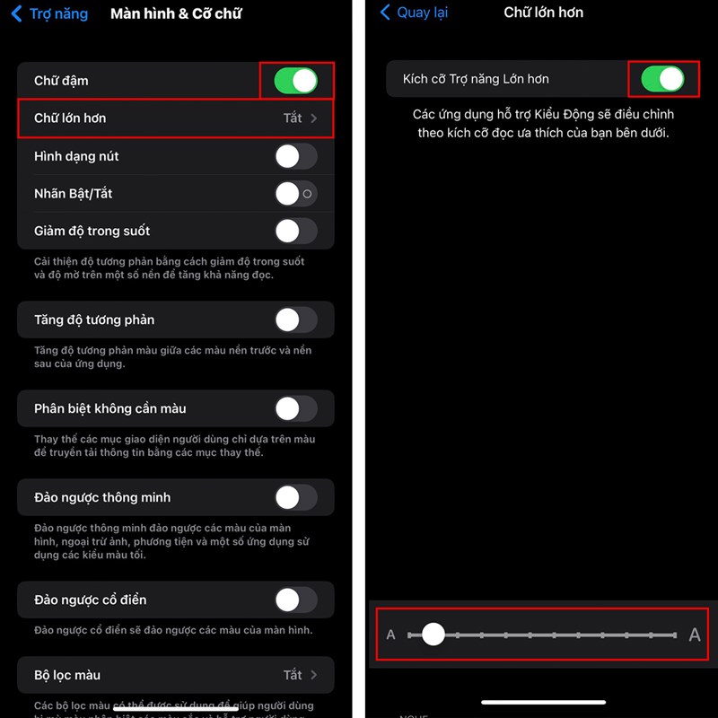Bước 2: Tại đây bạn bật chế độ Chữ đậm là được nè. Ngoài ra bạn có thể chọn vào Chữ lớn hơn, bật chế độ Kích cỡ trợ năng lớn hơn và điều chỉnh cỡ chữ như bạn mong muốn nha.