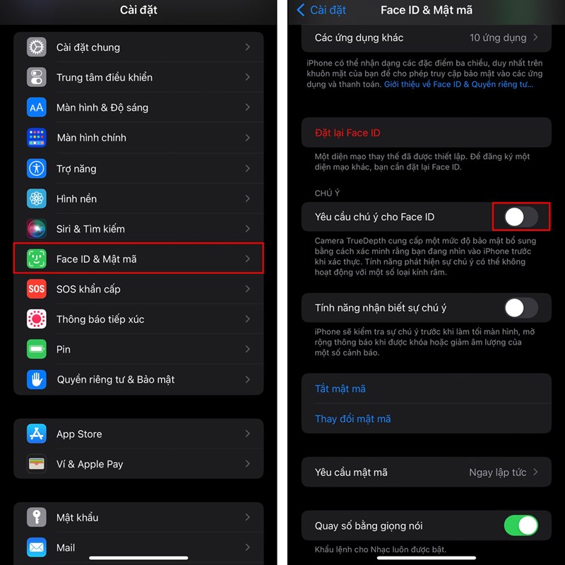 Với mẹo này sẽ giúp iPhone của bạn nhận diện Face ID tốt hơn đó. Vào Cài đặt > Chọn Face ID & Mật mã > Vuốt xuống dưới và tắt chế độ Yêu cầu chú ý cho Face ID là được.