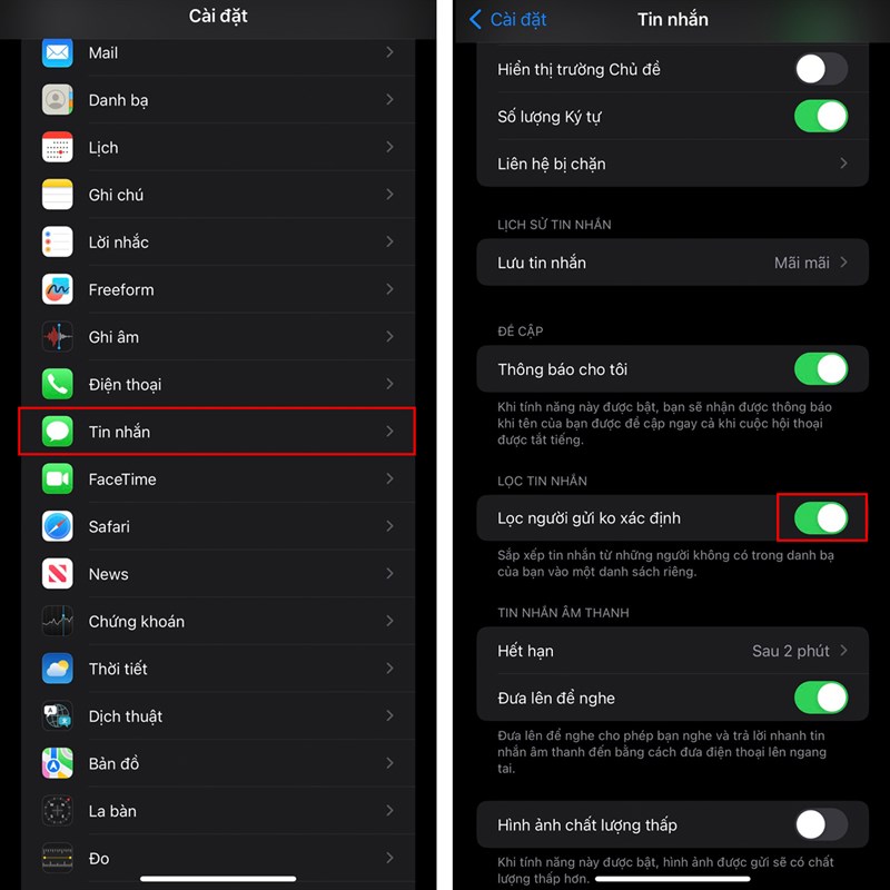 Bước 1: Bạn hãy truy cập vào Cài đặt của máy > Kéo xuống dưới chọn vào Tin nhắn > Kích hoạt chế độ Lọc người gửi không xác định lên.