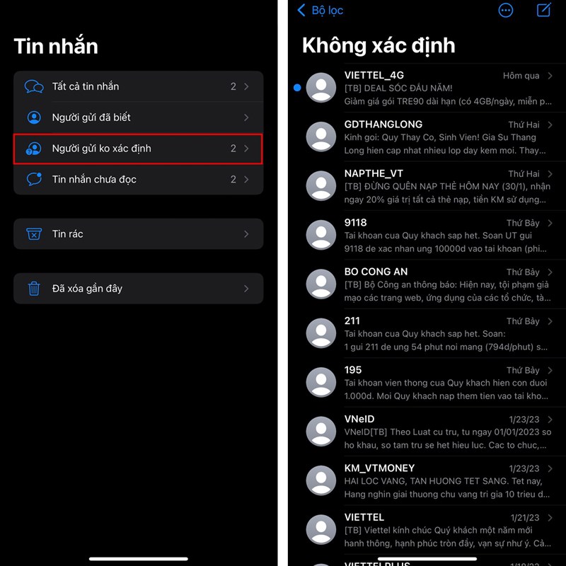 Bước 2: Mở ứng dụng tin nhắn lên sẽ có thêm mục Người gửi không xác định > Tại đây bạn có thể dễ dàng lưu trữ hoặc xóa đi những tin nhắn rác nè.