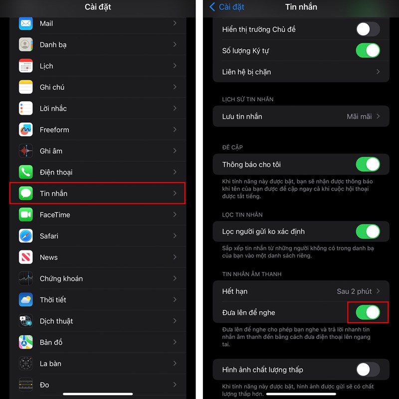 Thông thường với tin nhắn gửi dưới dạng âm thanh bạn sẽ phải nhấn nút Play thì mới nghe được phải không nào? Với mẹo sau đây sẽ giúp bạn không cần nút Play luôn nè. Vào Cài đặt > Tin nhắn > Bật Đưa lên để nghe là xong. Từ giờ bạn chỉ cần đưa máy lên là tin nhắn âm thanh sẽ tự động phát nha.